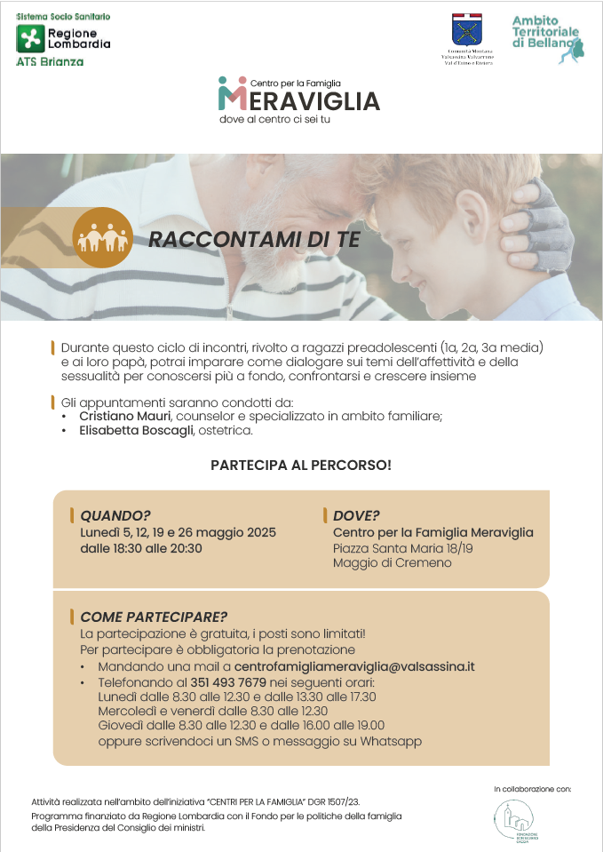 Durante questo ciclo di incontri, rivolto a ragazzi preadolescenti (1a, 2a, 3a media) e ai loro papà, potrai imparare come dialogare sui temi dell'affettività e della sessualità per conoscersi più a fondo, confrontarsi e crescere insieme. Gli appuntamenti saranno condotti da: