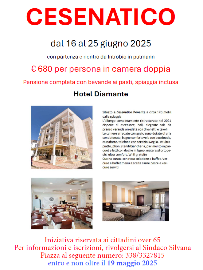 Dal 16 al 25 giugno 2025 presso l'Hotel Diamante. Partenza e rientro da Introbio in pulmann.